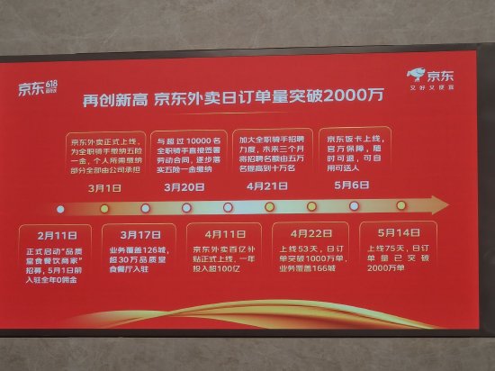 新浪科技讯 5月15日下昼音书,在“京东618惊喜通达日”上,京东外卖晓示,“上线75天,5月14日京东外卖日订单量如故打破2000万单。”
